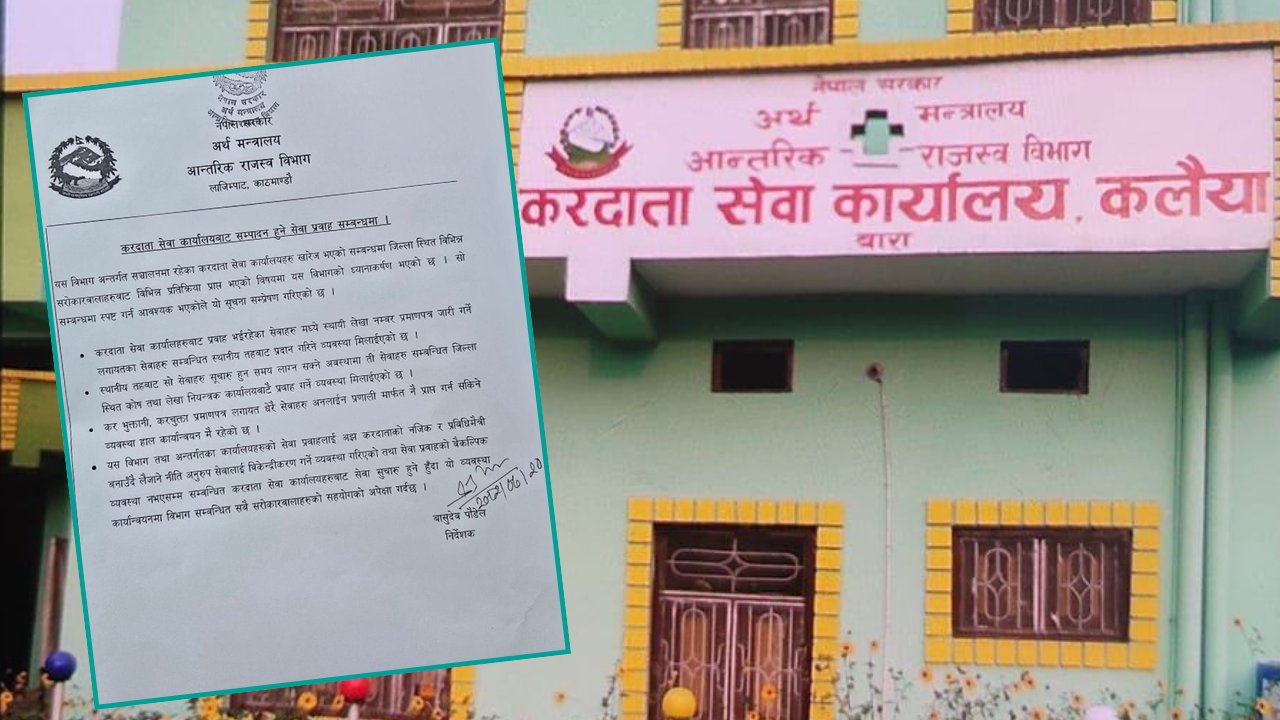 वीरगञ्ज, २० कात्तिक। सरकारले देशभरका करदाता सेवा कार्यालय खारेज गरेको छ । आन्तरिक राजस्व विभागले एक विज्ञप्ति जारी गर्दै सो जानकारी दिएको हो। यो सँगै बाराको सदरमुकाम कलैयामा रहेको करदाता सेवा कार्यालय हट्ने भएको छ।विभागका अनुसार अब देखि स्थायी लेखा नम्बर (प्यान कार्ड) लगायतका सेवाहरु स्थानीय तहबाटै हुने छ। यसअघि करदाता सेवा कार्यालयहरूबाट मात्रै प्यान कार्ड प्रदान गरिने व्यवस्था रहेको थियो ।“स्थानीय तहबाट सो सेवा सुचारु हुन समय लाग्न सक्ने अवस्थामा ती सेवा सम्बन्धित जिल्लास्थित कोष तथा लेखा नियन्त्रक कार्यालयबाटै प्रवाह गर्ने व्यवस्था मिलाइएको छ” विभागले जारी अरेको सूचनामा उल्लेख छ ।त्यस्तै कर भुक्तानी, कर चुक्ता प्रमाणपत्र लगायतका सेवा अनलाइन प्रणालीमार्फत नै प्राप्त गर्न सकिने व्यवस्था रहेको विभागले जनाएको छ।