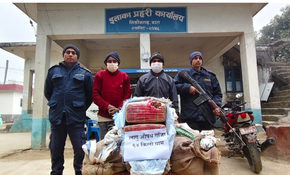 वीरगञ्ज,१२ पुस । बारा प्रहरीले लागूऔषध गाँजासहित दुई जनालाई पक्राउ गरेको छ ।पक्राउ पर्नेमा बारा जिल्लाको सिम्रौनगढ नगरपालिका ३ नयाका टोल बस्ने अन्दाजी ४० वर्षीय राजकिशोर हजरा र देश भारत बिहार राज्य मोतिहारीको बनकटवा थाना अगरवागाँउ बस्ने अन्दाजी ५० वर्षीय सुरेश रहेको जिल्ला प्रहरी कार्यालय बाराले जनाएको छ ।इलाका प्रहरी कार्यालय सिम्रौनगढबाट प्रहरी निरीक्षक कृष्ण देव प्रसाद साहको कमाण्डमा र प्रहरी चौकी अमृतगंजखजानीबाट प्रहरी सहायक निरीक्षक विश्वराज प्रसाद कुशवाहाको संयूक्त रूपमा खटिएको प्रहरी टोलीले विशेष सूचनाको आधारमा शुक्रबार राति ऊनीहरुलाई लागूऔषधसहित पक्राउ गरेको हो ।बारा जिल्लाको सिम्रौनगढ नगरपालिका वडा नं.३ बडपुरवा स्थित गगांनगरबाट नयकाटोल तर्फ ऊनीहरूले जुटको बोरामा राखी पिठ्युमा बोकी लुकिछुपि ओसारपसार गर्दै गरेको अवस्थामा लागूऔषध गाँजा ६४ किलो ४५० ग्राम (४ वटा जुटको बोरा ) बरामद गरिएको बाराका निमित्त प्रवक्ता एवम् प्रहरी निरीक्षक सुरेश राज भट्टले जानकारी दिएका छन् ।